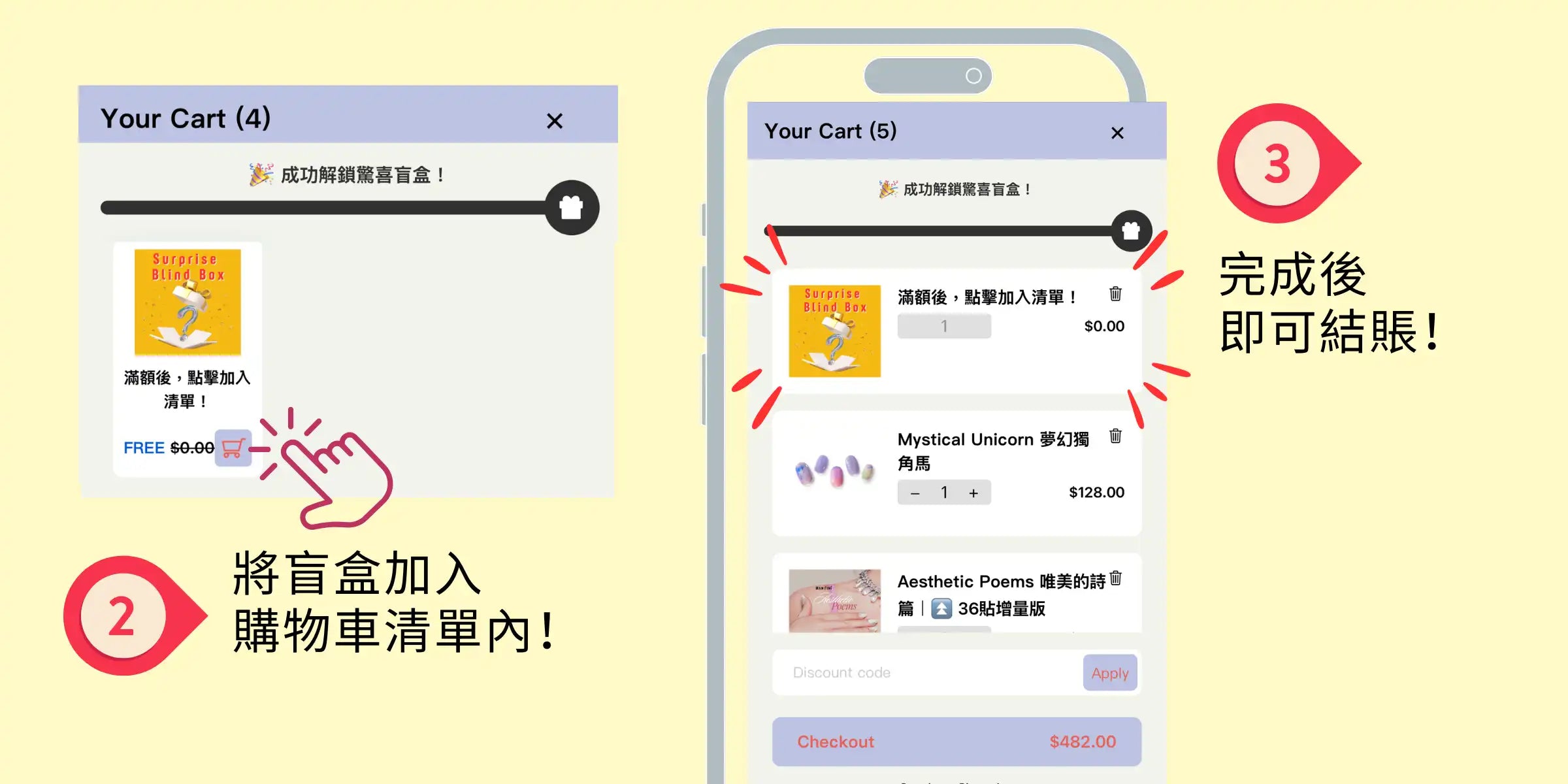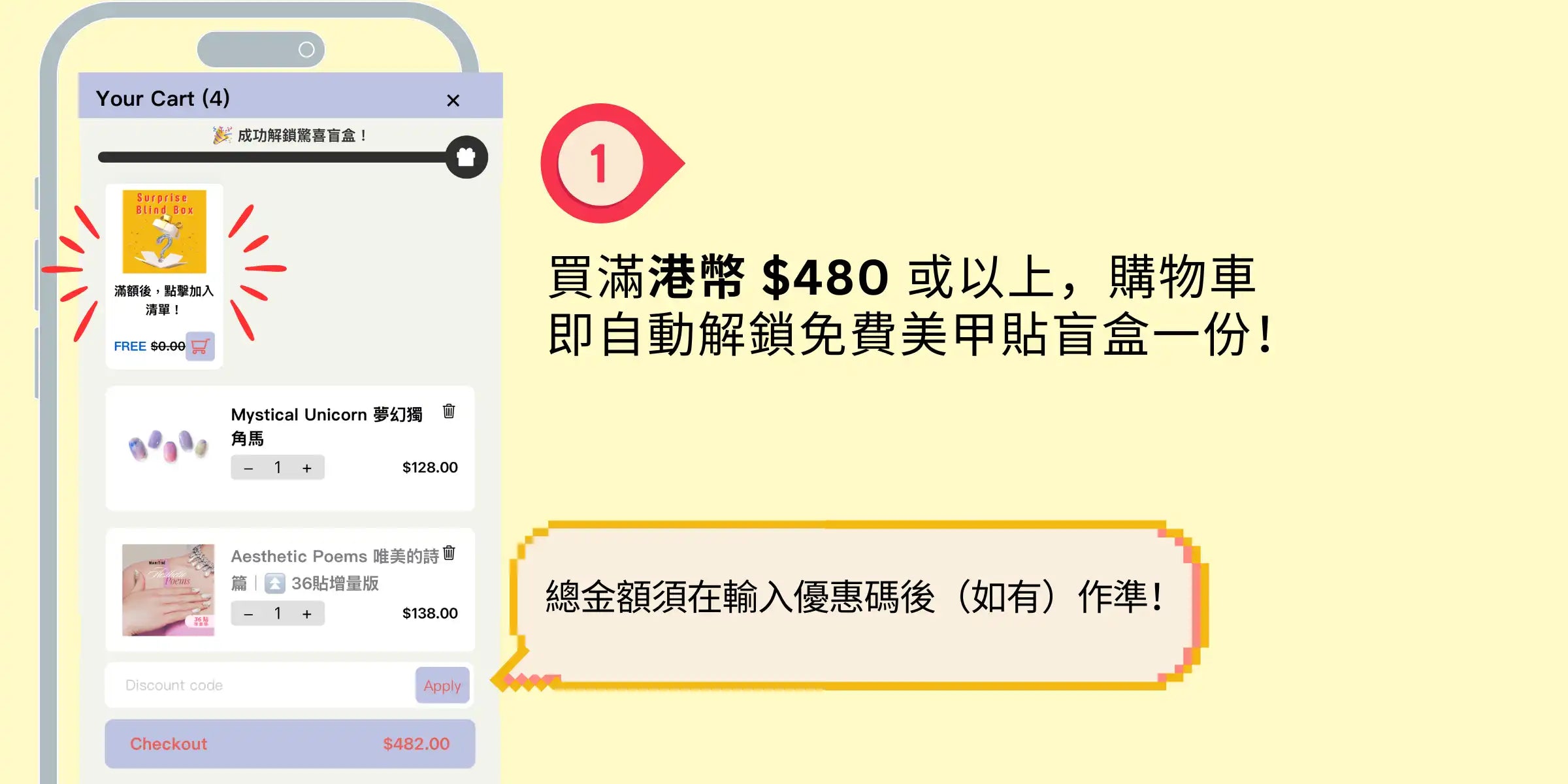 任何顧客消費滿港幣 480 元,即可獲贈驚喜盲盒 — 美甲貼一盒!